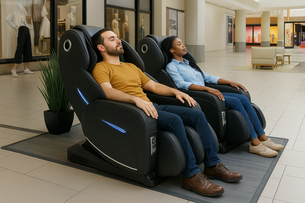 Transformamos espacios de alto tránsito como malls, aeropuertos, oficinas y eventos en zonas de bienestar. Nuestras sillas de masaje brindan una experiencia de relajación instantánea, sin necesidad de asistencia ni reservas.
